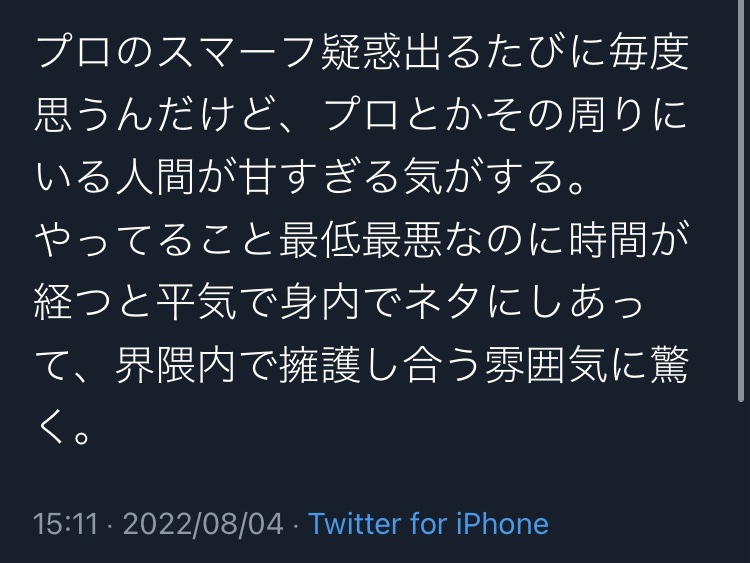 矛盾してるぞ - 名前:名無しさん 投稿日:2022-08-06 09:46:16返信するプロでもやってるんだからスマーフなんてやってて当たり前なんだよな