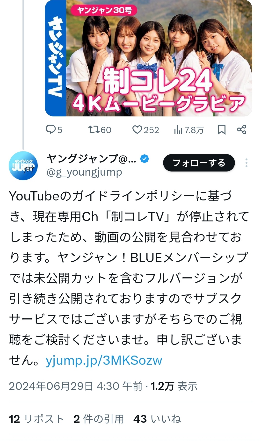 - 名前:名無しさん 投稿日:2024-07-11 18:16:28返信するヤンマガもYouTubeで動画出しているが…