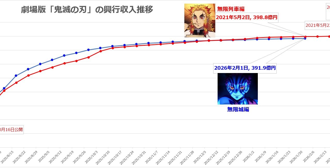 それでも300億越えってすごいじゃん。 - 名前:名無しさん 投稿日:2026-02-13 22:15:38返信する4月から最初からの再放送があるし、それが終ったら無限列車の時と同じようにリバイバルもあるだろうから、最後には超えそう?